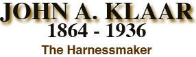 John Adam Klaar was born in Berneberg, Germany on January 2, 1864. In 1870, when he was six years old, he and his parents came to America and settled in Amherst, Ohio. The year 1870 is referred to by some historians as "The Golden Age of the Horse" in our country. That year the U.S. census reported that there were 7,607 harness businesses throughout the nation, employing 23,557 harness makers. Of the 258 industries listed in the census, harness making and saddlery ranked 34th in the number of people employed nation-wide. Given these statistics it is little wonder that Mr. Klaar chose this vocation as a youngster, and went on to cultivate his craft in shops in both Amherst and in Wellington.