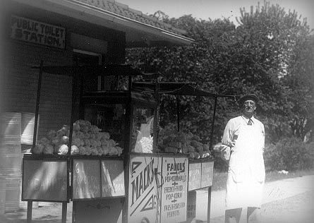 By the Spring of 1941 when P. Roscoe took this picture Mack had added more display space, enclosed it with glass, and made new awnings to dress things up a bit. The sign on the front of the stand told folks that he was selling "Mack's Famous popcorn-balls, french-fried popcorn, and fresh-roasted peanuts."