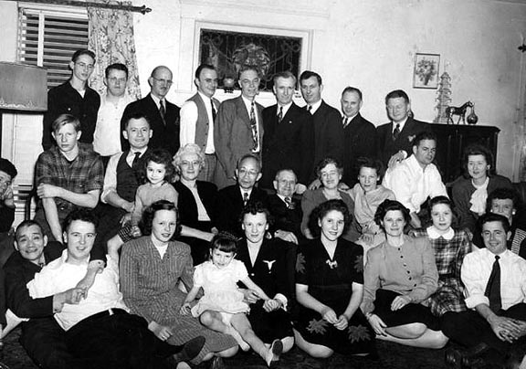 Starting at the front row left to right: Otto (Okagi Restaurant's Japanese chef); Russ Vasbinder (who eventually became co-owner of the restaurant with Cecil Thomas), Nancy Tarrant (Emery), Paula Thomas (Cecil and Rose’s young daughter), Mrs. Russell (Mary) Vasbinder, Eloise Marks (Tyren), Mrs. Paul (Eileen) Naegele, Mary Emmerick (Robinson), Cecil Thomas, Mrs. Ernest (Marie) Koppenhafer (behind Cecil). Middle row: Philip Tarrant, Steve Martin with his daughter Gerry, Clara Strehle Rosenkranz, Mr. Okagi, A.D. Baumhart , Mrs. (Francis)Baumhart, Mrs. Cecil (Rose) Thomas, Leonard and Betty Croll McMillen.