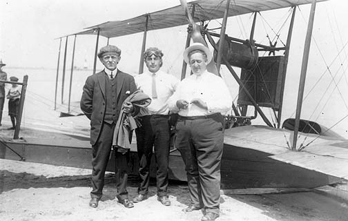 Later he would again take flight and land on the lake just off the beach at Linwood Park. There the Benoist Airboat would be beached and Vermilion News Editor-Publisher, Pearl Roscoe, would take this well known photo of Tony Jannus flanked by Vermilion's Charlie Trinter (left), and Lewis Englebry (right).