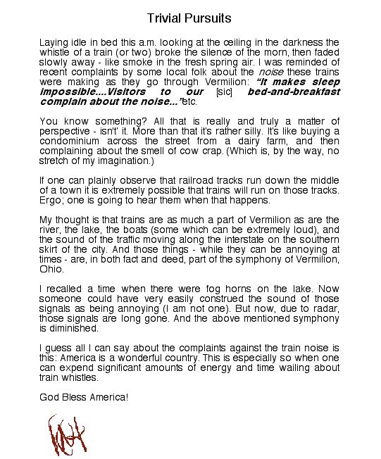SPRING BREAKS: This scene from the end of last summer is used here simply because it's a nice pic. It's Vermilion. But Spring is now bursting here. The daffodills and crocus'/croci(?) are up and the tulips are coming along. The forcast is 70 degrees for Easter. It's been a rather mild winter. The lake never froze over completely. Very little snow fell. East of Cleveland (i.e. the "snow belt") received their share - but we got very little. Tis hard to say whether that's a good or bad thing.