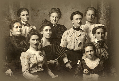 Alice. Without counting any wrinkles the clothing and hair style of the ladies appears to date between 1900-1904. The fan one woman has in her hand would place it before 1900 (perhaps 1880). But the ribbons in their hair and on their dresses says no. So it's probably safe to date the pic.1904. The fact that fashions (among other things) - 100 years ago - were so rapidly and widely dispersed across America without the help of the current media forms - so that one can date these photographs with some accuracy - may tells us something about human character. I'm certainly glad that piercing and tattooing weren't popular among American women back then. (Note that none of the women have earrings.) What a nice photograph.