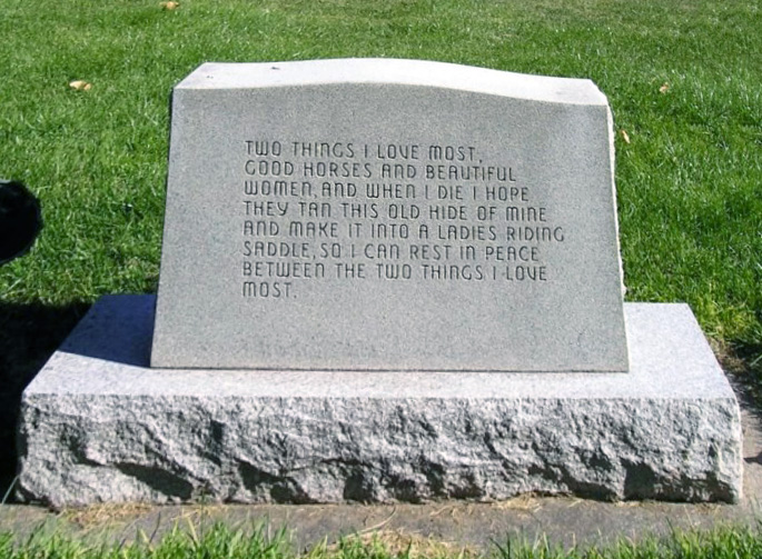 The above sketch by another friend, Frank Homitz, accurately (I believe) portrays the tough life of the American cowboy forever on the move. And the tombstone (below) sent to me by Jim tells of the wonderful cowboy sense of humor even when he stops moving. It is the very real headstone of Russell J. Larson in the Logan City Cemetery, Logan, UT. A Real Cowboy Tombstone.