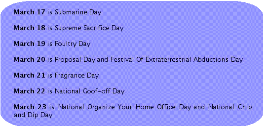 The Beat Goes On: The page is generated by the dreaded Macintosh Computer and is written and designed by (me) Rich Tarrant. It will change weekly ~ usually on Saturday. Bookmark the URL (Universal Resource Locater) and come back at your own leisure. Send the page to your friends (and enemies if you wish). If you have something to share with those who visit this page, pass it on. And if you see something that is in need of correction do the same. My sister, Nancy, is a great help in that respect. It only takes me a week to get things right. And follow the bookmarks. You might find something you like. If you experience a problem with them let me know. Also, if you want to see past editions of this eZine check the new archives links below.