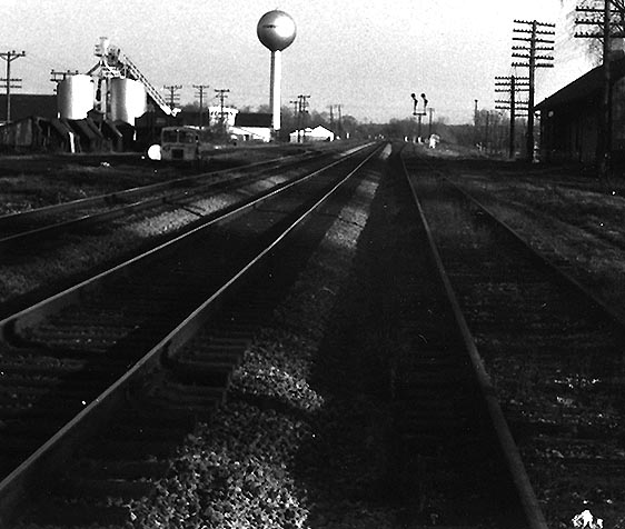 NEW PIX: From Vermilionite Viewer Fred Wetzler comes this great view looking eastward directly down what were once the New York Central railroad tracks (now Norfolk & Southern etc.) from (approximately) the Division/Main Street crossing. This pic is a scan from a 3.25 by 4.5 inch snap. It is c.1959. 3 sets of rails still ran through town at that time, and the station (to the right) was probably still in some use at that time. Corky and Fred Harpley used to pick-up and deliver freight from that station - probably into the 1960's.