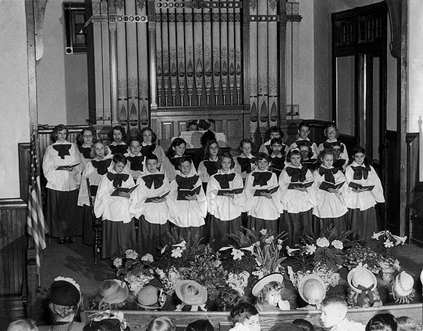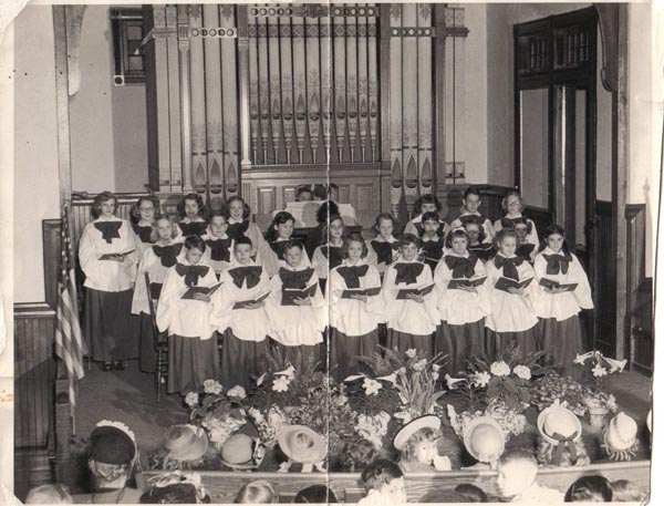 This is (to borrow a phrase from Lawrence Welk) "a wonderful, wonderful" photo of that choir taken during Easter Service. It's difficult not to notice the flowers in front of the alter, and the hats and gloves worn by the young ladies in the front pew of the church.