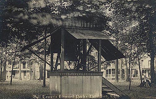 LINWOOD BELL TOWER: I've had a copy of this postcard for quite a long time but never used it. It is, as marked, a photo of Linwood Park's Bell Tower. And I know nothing about it. I don't recall ever seeing anything like it during my travels through the park.