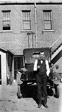 A.D.: An encore photo from the vault of Fred Wetzler comes this marvelous picture. I'm going to stick my neck out here and proclaim this particular photograph to be extremely rare. This, of course, is A.D. Baumhart standing at the back of his store on Division (Main) Street. It is the 13th of July, 1919. The store was built in 1916.
