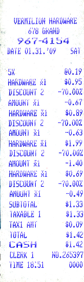 WILL THE LAST ONE OUT THE DOOR...: Well, it's official. Bailey's wonderful Vermilion Hardware Store now belongs to the ages. My friend Larry E. Howell was the last customer. He was kind enough to lend me his receipt along with a number of photographs pertaining to the Bailey Family and the hardware store to scan / download to my computer to save for the Vermilion Area Archival Society.