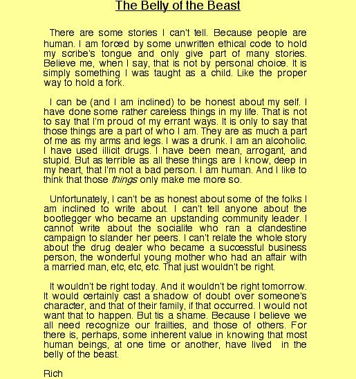 The Beat Goes On: The page is generatedby the dreaded Macintosh Computer and is written and designed by (me) Rich Tarrant. It will change weekly ~ usually on Saturday. Bookmark the URL (Universal Resource Locater) and come back at your own leisure. Send the page to your friends (and enemies if you wish). If you have something to share with those who visit this page, pass it on. And if you see something that is in need of correction do the same. My sister, Nancy, is a great help in that respect. It only takes me a week to get things right. And follow the bookmarks. You might find something you like. If you experience a problem with them let me know. Also, if you want to see past editions of this eZine let me know and I'll send them to you.