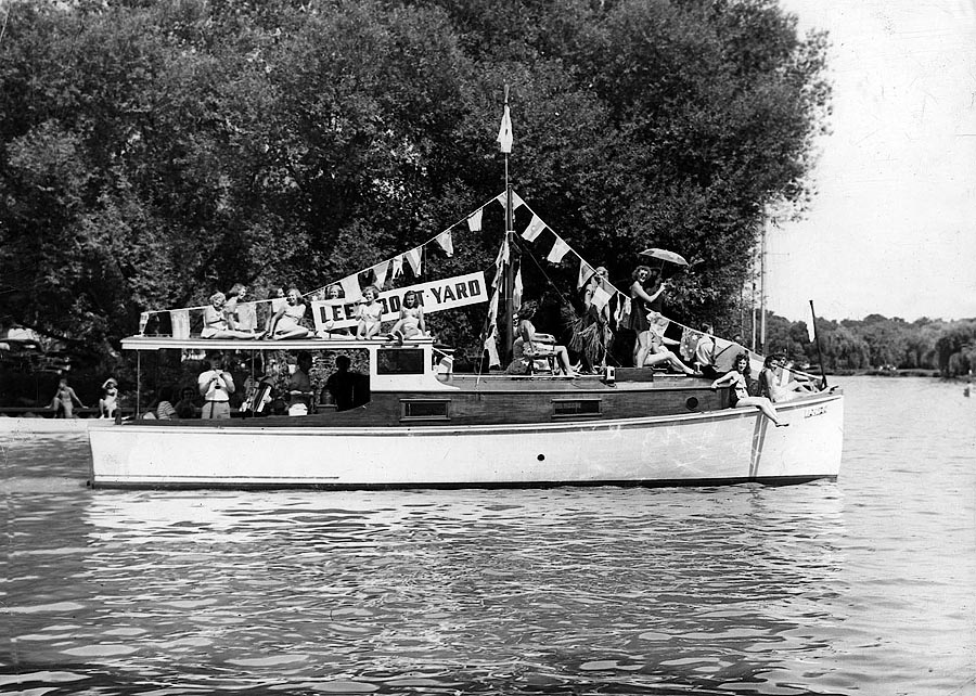 For some those days were golden. At least that would be the impression one derives from the photo. It was a cloudless afternoon in full summer. Whether the cruiser was part of a floating parade for Regatta watchers or simply a floating advertisement for Mr. Lees marina is unknown. (Although It was probably a bit of both.) But clearly the floating float was intended to attract the attention of the public.