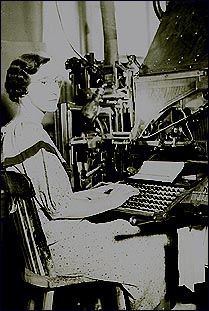 The particular linotype machine still exists (and is probably operable) exactly where you see it in this picture. Even the chair upon which this lady sits remains.