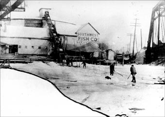 Southwest Fish: Long gone from the riverfront between the L.S.E. (electric) bridge and the Vermilion River Bridge was the Southwest Fishing Company. Owned and operated by Captain Ed Lampe, it was a thriving business when my grandfather, Pearl Roscoe, took this photo. Note the round ice-house behind the river buildings. It was a very unusual structure. At some point in time it burned down. And unphased by disasters (because he weathered many of them) Big Ed rebuilt and went on with business as usual.