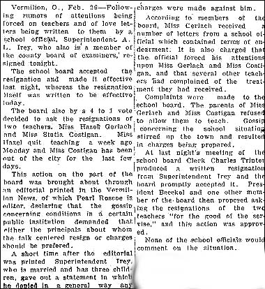 A Scandal: I need to preface this next piece with some commentary. The article you are about to read was taken from The Elyria Chronicle in the "early part of the 20th century". That all was not always well in paradise is perhaps something each of us understands but seldom consider. In 1922, for instance, the Village of Vermilion, Ohio was still a settlement of under 2000 people. So imagine what happens when someone comes along and breaks the rules of a decent society despite its size. Were an incident similar to this to happen today it is highly unlikely that anyone would pay much attention to it. Far worse things are taking place. But it wasn't today. It was nearly a century ago. And, most importantly, it happened in a little town where everybody knew everybody, their relatives, their friends, and Yea even the names of their pets.