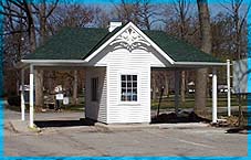 The Gate Again: Ah, The Gate at Linwood. Finished at last. Now Mr. Boas' book and articles on the park will ring true again. Doesn't look like expenses were spared. This is obviously an integral part of the place. Pourquoi? I know not. In recent years I've gone into the park to deliver Meals-Upon-Wheels and nobody has said anything to me. Nobody was in the gatehouse. I know there must be a reason for this structure. Very mysterious.