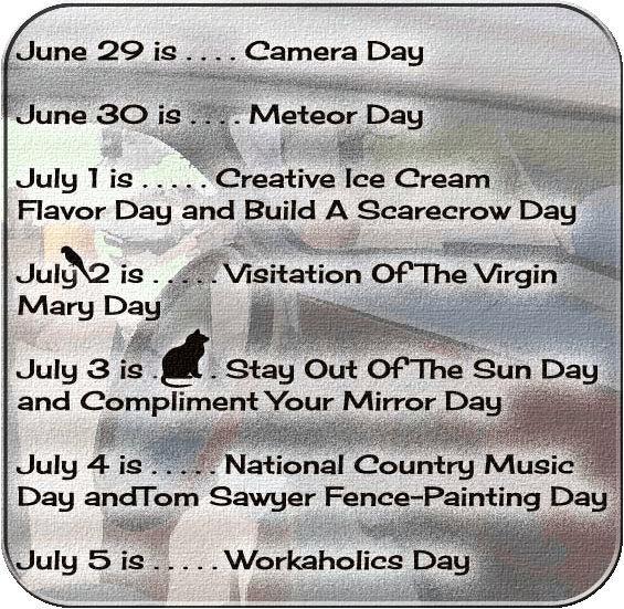THE BEAT GOES ON: This page is generated by a dreaded Macintosh Computer and is written and designed by (me) Rich Tarrant. It will change weekly ~ usually on Saturday. Bookmark the URL (Universal Resource Locater) and come back at your own leisure. Send the page to your friends (and enemies if you wish). If you have something to share with those who visit this page, pass it on. And if you see something that is in need of correction do the same. My sister, Nancy, is a great help in that respect. It only takes me a week to get things right. And follow the links. You might find something you like. If you experience a problem with them let me know. Also, if you want to see past editions of this eZine check the new archives links below.