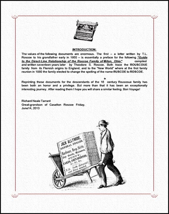 VNPSM PUBLICATIONS: Thus far this year I’ve printed three books at the museum: a revised edition “Yesteryear” (stories of Vermilion, Ohio and it’s People); “The History of The Vermilion News” by Nancy Alice Tarrant-Emery; and a revised edition of “The Roscoes” – “The Evolution of an American Family – 1546-1930. The introduction page is below.