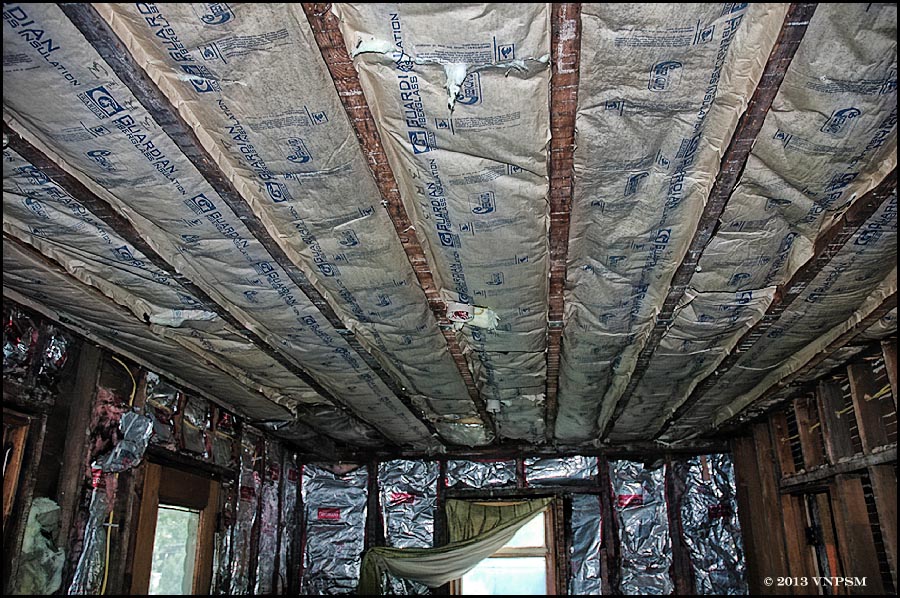 Jerry Gerstacker (the building contractor) leveled the rafters (they were sagging a bit) in the living room also on Tuesday, and Geo and I started insulating the ceiling on Wednesday [also a big task for nonprofessionals].