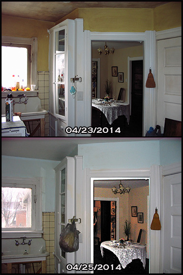 I painted the ceiling twice – and also painted the ceiling the bath. The walls, as is visible in upper pic, were yellow. I opted for a powder blue like color for the walls. After the walls were done I painted the doors and woodwork. It looks pretty nice. Anyway, it’s a substantial improvement.