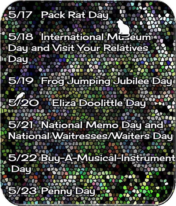 LOCAL ANNOUNCEMENTS: After giving it much thought this link has been "put-down". During the last year most of the folks who used to use this page as a bulletin board have acquired their own and, consequently, no longer need this forum from "Views". I have, however, kept links (in the links section) to Larry Hohler's "Hope Homes" in Kenya - and to Bette Lou Higgins' Eden Valley Enterprises sites. They are historically and socially relevant projects. I suggest that you visit these sites on a regular basis to see "what's shakin'".