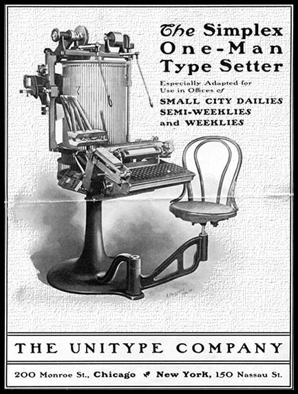 [VV. Ed. Note: I think (but don’t know for sure) that the “machine” referred to in this advertisement was the “Simplex One-Man” typesetting machine. It is an interesting looking device. In fact it was considered to be so useful at the time that they used the following advertisement to illustrate that fact: Nonetheless, it was not as useful as Mergenthaler’s Linotype. And it soon disappeared from print shops around the world.]