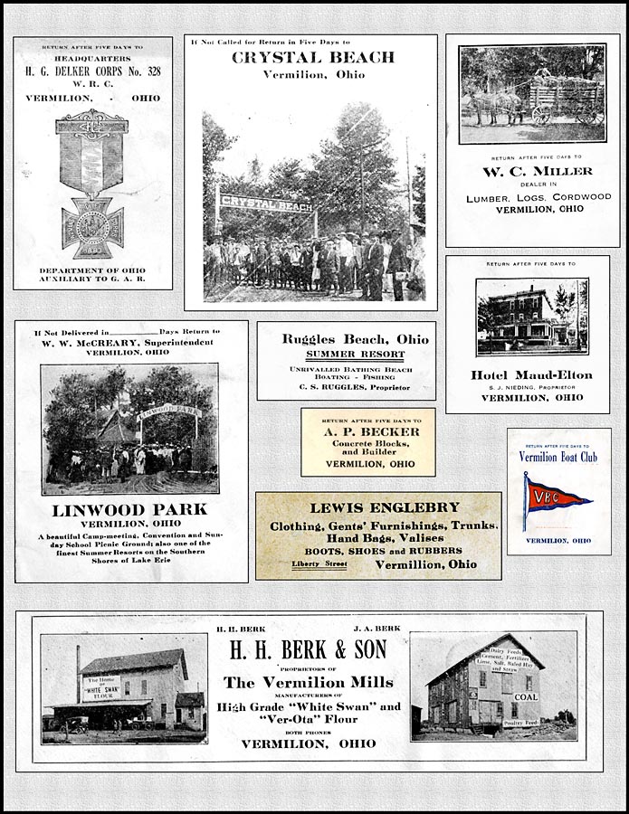Persons who collect postage stamps are called philatelists (\fə-ˈla-tə-lists\. There probably isn’t any fancy name for one who collects old letterheads and envelope return addresses. These particular items were cut and pasted into a scrapbook and were used as printer’s samples. It’s doubtful that the person / persons responsible for placing them in the book ever dreamed that they might become part of a historical record for the community of Vermilion, Ohio. But that is precisely what they are. They are individual pixels in a photograph that together form a portrait of a very colorful yesteryear.