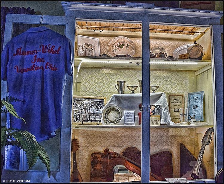 WORKING EXHIBITS: Below is a pic of the armoire that is now being used to display some of the items at the museum. On the middle shelf Sundae and Phosphate cups from the A.D. Baumhart Drugstore are on display along with the pic of the interior of the store (left). On the right are 2 menus from the Park Restaurant that once occupied some rooms in the Fischer Building in downtown Vermilion. There is also a glass from the McGarvey Restaurant and a small calendar from Hart’s Corner Drugstore.
