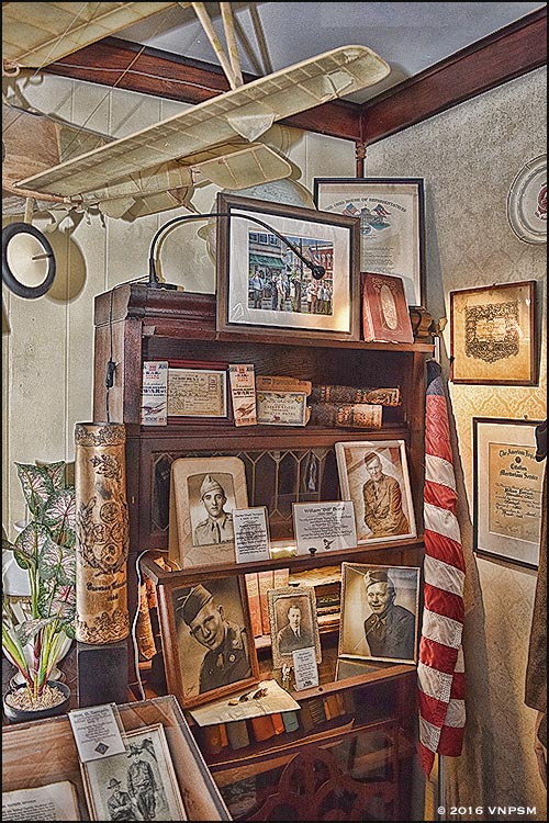 The pic below shows part of the military exhibit at the museum. Some of the articles are personal to my family and some are not. They cover WW1, WW2 and Korea. I just added some additional lighting to this exhibit