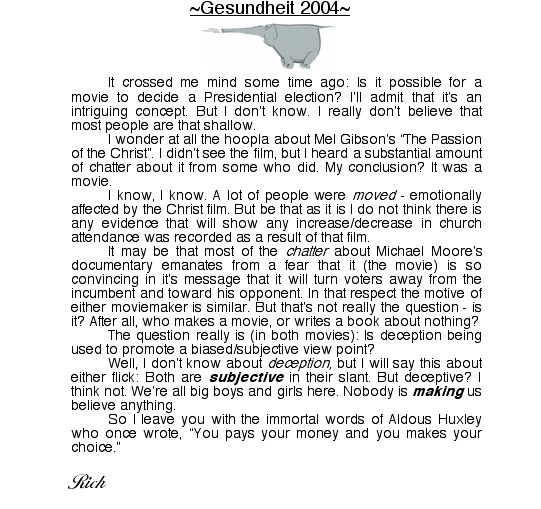 The Beat Goes On: The page is generated by the dreaded Macintosh Computer and is written and designed by (me) Rich Tarrant. It will change weekly ~ usually on Saturday. Bookmark the URL (Universal Resource Locater) and come back at your own leisure. Send the page to your friends (and enemies if you wish). If you have something to share with those who visit this page, pass it on. And if you see something that is in need of correction do the same. My sister, Nancy, is a great help in that respect. It only takes me a week to get things right. And follow the bookmarks. You might find something you like. If you experience a problem with them let me know. Also, if you want to see past editions of this eZine let me know and I'll send them to you.