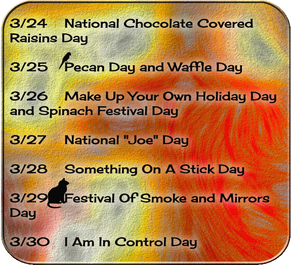 THE BEAT GOES ON: This page is generated by a dreaded Macintosh Computer and is written and designed by (me) Rich Tarrant. It will change weekly ~ usually on Saturday. Bookmark the URL (Universal Resource Locater) and come back at your own leisure. Send the page to your friends (and enemies if you wish). If you have something to share with those who visit this page, pass it on. And if you see something that is in need of correction do the same. My sister, Nancy, is a great help in that respect. It only takes me a week to get things right. And follow the links. You might find something you like. If you experience a problem with them let me know. Also, if you want to see past editions of this eZine check the new archives links below.