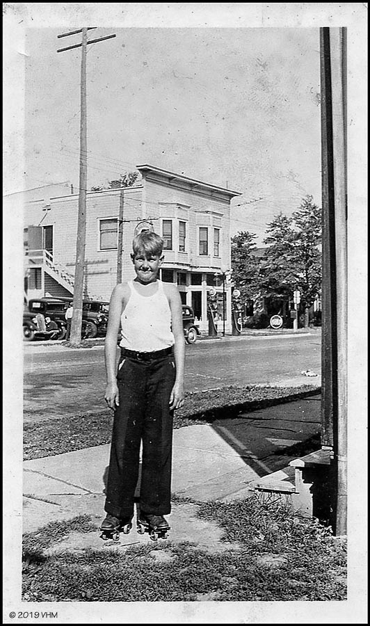 Billy was born in Vermilion on May 3, 1924. The snap was probably taken in 1936 or ‘37 when he was 12 or 13 years old. The building in the background is gone now replaced by Vermilion’s Friendship Park. At the time the ground floor of the building was the home of Glenn Martin’s Pontiac dealership / garage. [Note: They sold gas right on the street at that time.] Young Billy was apparently out sidewalk skating [remember that?] on a nice summer day. He looks very happy.