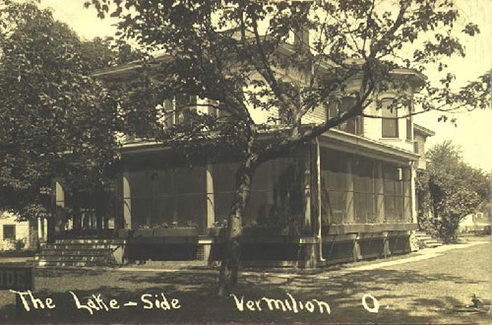 THE LAKESIDE HOTEL: There are several different pictures of the Lakeside house in circulation. This one is rather striking. While the structure (to those familiar with old houses in Vermilion) is readily familiar the latter part of the sign in the front yard affords us an unusual insight to the business place, and the huge screened-in porch tells one of some very warm summer evenings pleasantly passed by many visitors to the lakeshore community.