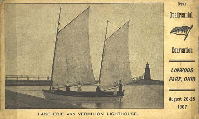 QUADRENNIAL???: A very creative thought/word from the past. The obvious thought was that it was the 5th Annual convention at Linwood Park. The precise name of the conference is not stated beyond the initials on the flag graphic. But despite that this is a great picture. This is a vessel of substantial size. It causes one to wonder about the draft of the east side of the stream in the early 20th century. One must also wonder about those on board. The assumption has to be (due to their apparel) that they were passengers and not crew. A further assumption might be that the photograph was posed/staged. Not only because all are obviously cognizent of the camera/photographer but, again, because of their dress. The craft may be of good size but it is nonetheless a pleasure boat - not a commercial passenger boat. Were someone to slip over the side wearing all those clothes staying above the water for long would be well out of the question.