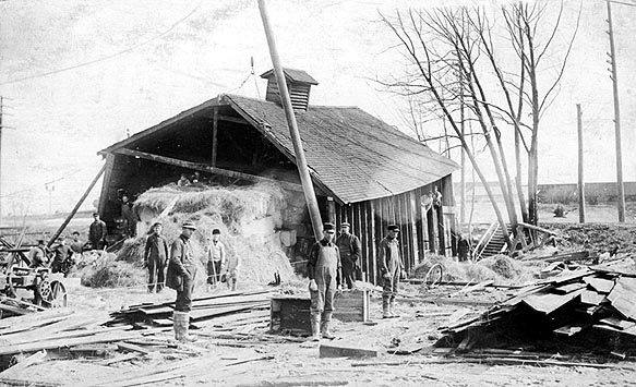 BARN RAZING: This photograph appears on an unmarked postcard owned by Warren and Anita Mehnert. When scanned 200% larger than the card the details are intriguing. There are some 16 men and one boy in the picture. The barn, filled with hay, appears to have collapsed, and is being supported by a crane. There appears to be a motorized winch also attached to the bottom of the barn. By all indications (i.e. the planks stacked about the area) it looks like the barn is being razed after it partially collapsed.
