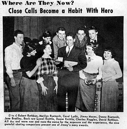 As some folks may remember, Jimmy Moses was responsible for saving the lives of all the kids in the picture when their skating party became stranded on an ice floe off Ruggles Beach 10 years earlier. He received many awards for heroism, including a Carnegie Medal, and appeared on a radio broadcast.