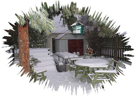 HERE WE GO (AGAIN)!!: This was taken out the backdoor of our home at 8:25 this morning (1-22-005). It wasn't too bad at 6:30, but the snow began to pick up speed as the hours passed. Those in milder climes will appreciate this. I doubt that our Michigan and Minnesota "Viewers" find this weather unusual. But, thus far, this year the weather in Vermilion has truly been wintry.